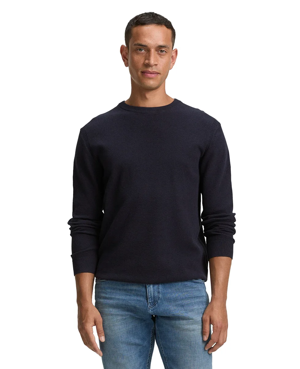 Osnovni muški džemper u modernoj mornarsko plava melanž boji, izrađen od kvalitetne teksturirane pamučne tkanine.