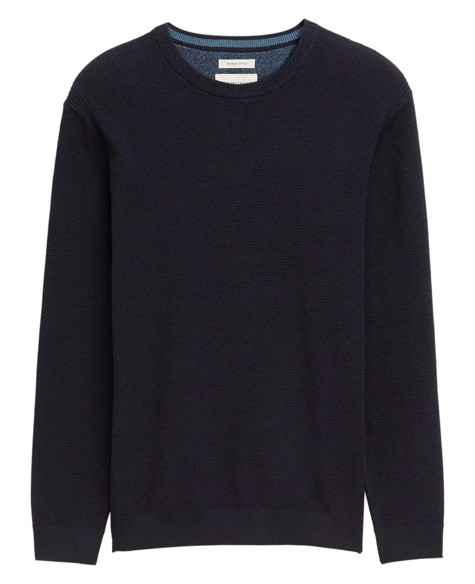 Osnovni muški džemper u modernoj mornarsko plava melanž boji, izrađen od kvalitetne teksturirane pamučne tkanine. Klasičan okrugli izrez i regularni kroj čine ga svestranim komadom garderobe pogodnim za svakodnevno nošenje.