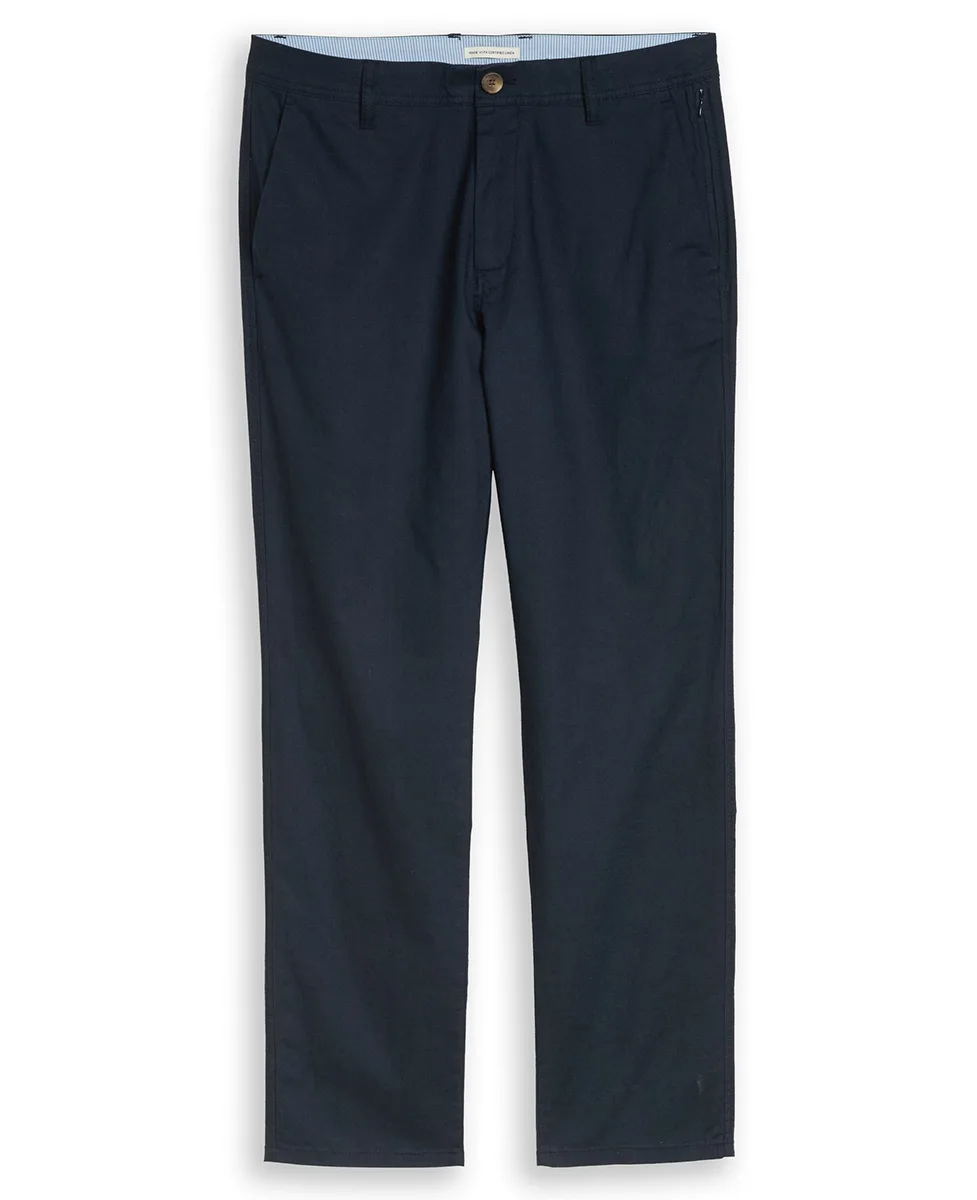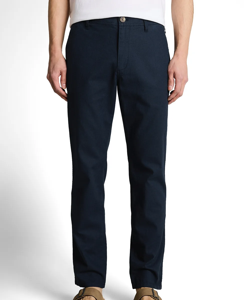 Muške chino hlače izrađene su od kvalitetne mješavine certificiranog lana i pamuka, što ih čini laganim, prozračnim i idealnim za toplije vremenske uslove. Prirodni lan pruža osjećaj svježine i rashlađivanja, dok pamuk doprinosi udobnosti i mekoći materijala. Regular fit kroj s ravnim nogavicama i srednjim strukom osigurava klasičan i uredan izgled koji se lako uklapa u casual i smart-casual kombinacije. Hlače dolaze u modernoj “sky captain blue” nijansi, s praktičnim bočnim kosim džepovima i stražnjim džepovima.