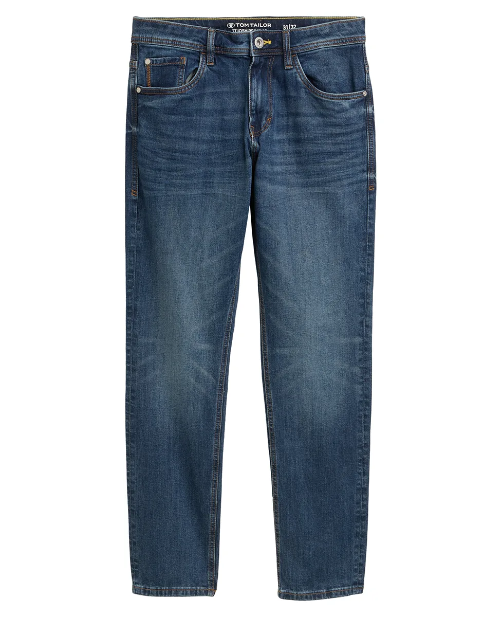 Tom Tailor TTJOSH Regular Slim hlače u slim fit kroju sa srednje visokim strukom. Izrađene od pamuka s dodatkom recikliranog pamuka i elastana za veću fleksibilnost i udobnost. Klasični five-pocket dizajn i isprani plavi denim.