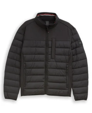 Muška hibridna prošivena jakna u klasičnoj crnoj boji predstavlja bezvremenski komad koji se lako uklapa u svaku garderobu. Dizajnirana u regular fit kroju (ravni kroj), pruža udobnost i slobodu pokreta, dok stand-up kragna daje dodatnu zaštitu i moderan, uredan izgled.