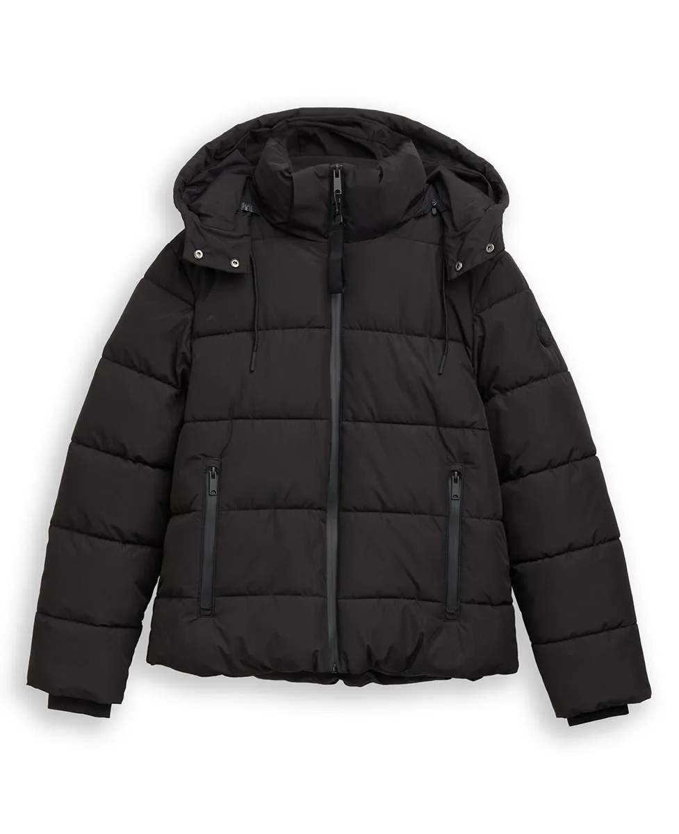 Elegantna ženska puffer jakna iz Tom Tailor kolekcije Jesen/Zima 2025, izrađena od prozračnog i vodoodbojnog materijala, savršena za hladne zimske dane. Zahvaljujući punjenju od visokokvalitetnih REPREVE® vlakana, ova jakna pruža toplinu, udobnost i doprinosi zaštiti okoliša.Model dolazi u bezvremenskoj crnoj nijansi Deep Black, s regularnim krojem (Regular Fit) koji osigurava udobno pristajanje i slobodu pokreta. Jakna ima odvojivu kapuljaču, stojeći okovratnik, kao i praktične bočne džepove sa rajsferšlusom i dodatni unutrašnji džep za sigurno odlaganje ličnih stvari. Suptilni detalji na patentnom zatvaraču i diskretna logo značka na rukavu upotpunjuju sofisticirani i funkcionalni dizajn.