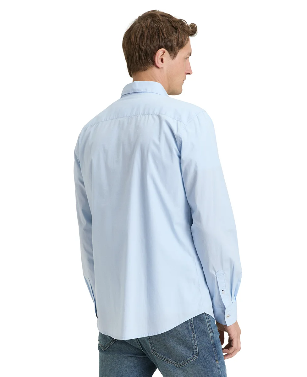 Muška košulja regular fit kroja u svijetlo plavoj boji. Izrađena od 98% pamuka i 2% elastina za veću udobnost i fleksibilnost. Ima Kent kragnu, duge rukave i kopčanje na dugmad. Klasičan jednobojan dizajn bez džepova, savršena za poslovni i smart-casual stil.