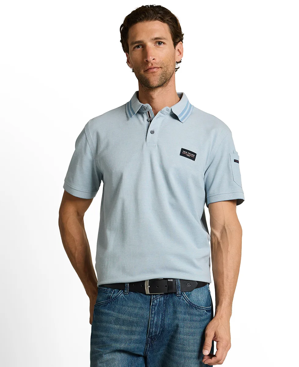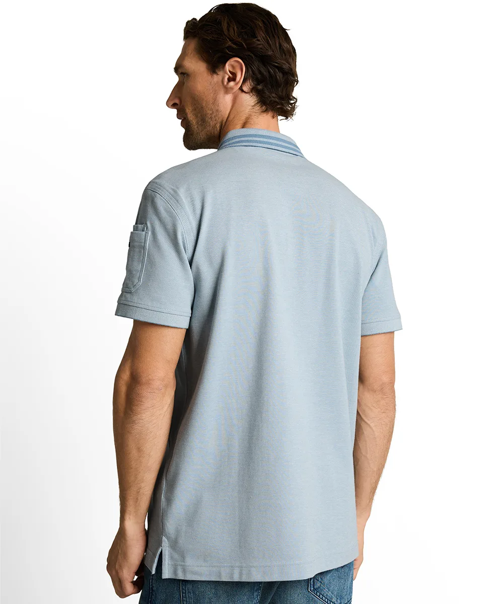 Muška regular fit polo majica sa džepom na rukavu, plavo-bijele melange boje. Izrađena od piqué pamuka sa elastinom za udobnost. Klasično zatvaranje na dugmad i polo ovratnik, idealna za casual i poslovno-casual kombinacije.