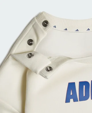 Komplet je izrađen u regular fit kroju koji omogućava lako kretanje, dok srednje visoki struk na donjem dijelu pruža sigurno i udobno pristajanje. Gornji dio ima rebrasti okovratnik koji doprinosi boljem prijanjanju i modernom izgledu. Materijal od interlock tkanine (59% reciklirani poliester i 41% pamuk) mekan je na dodir i ugodan za cjelodnevno nošenje.